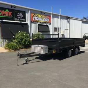 Our tipper trailers are designed for carrying the heaviest loads with a GVM of up to 3.5 tonne. They have a 6 stage hydraulic ram which is battery operated, with the battery and pump in a waterproof toolbox on the a-frame for easy access.